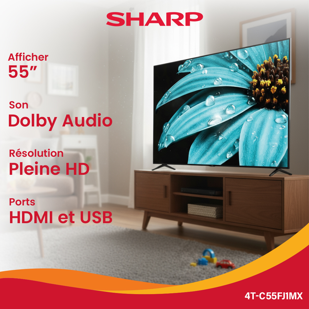 Avec son design moderne et épuré, le Sharp 4T-C55FJ1MX est un véritable centre multimédia haut de gamme, adapté aux salons spacieux ou aux environnements professionnels. Il offre une expérience Smart TV complète, fluide et intuitive, alliant qualité d’image, richesse fonctionnelle et connectivité intelligente.